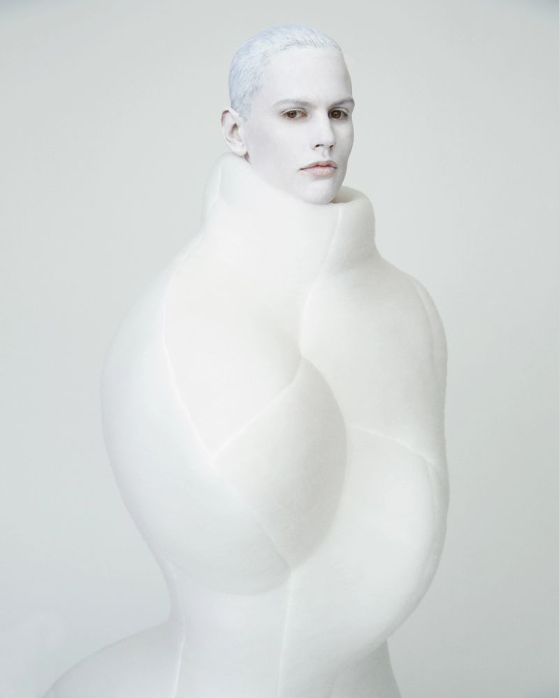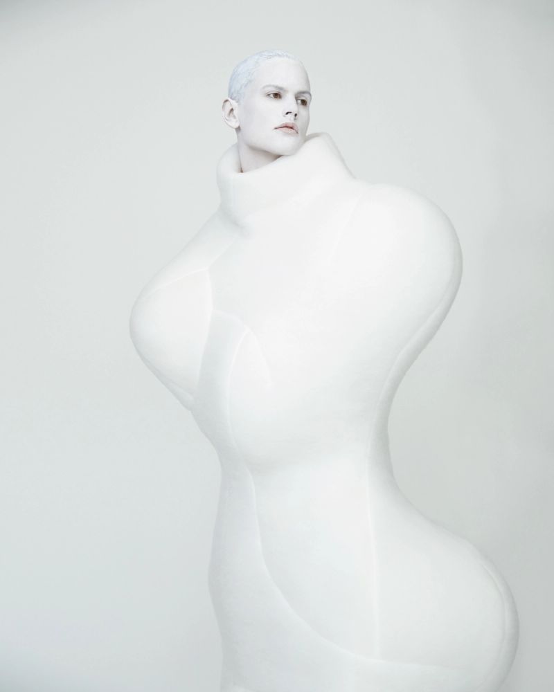 This garment is a land mine of artistic references. There is a photograph of the artist Louise Bourgeois, taken in 1975. She is standing in front of her New York City stoop, wearing a latex cast of her bubbling sculpture “Avenza” from the late ’60s. Its clusters presage Kawakubo’s nippled creation, and the similarity is reassuring and funny, like mother-and-daughter matching outfits. Speaking of these organic forms, Bourgeois said, “If you hold a naked child against your naked breast, it is not the end of softness, it is the beginning of softness, it is life itself.”