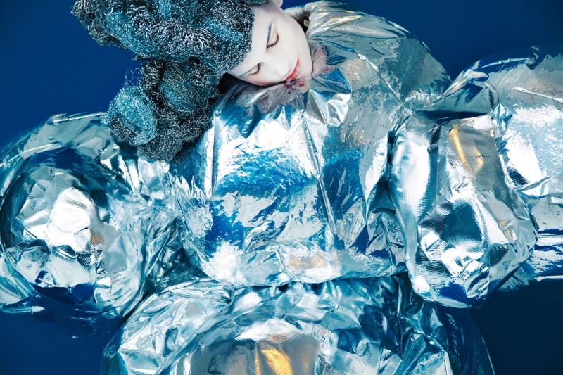 An exploded metallic popcorn kernel. I approach and am reflected, distorted in its crinkly, convex foil surfaces. It is all outer space. The model’s fingers barely poke out of the “sleeves.” Inside, the space is lined in smooth, undyed cotton.