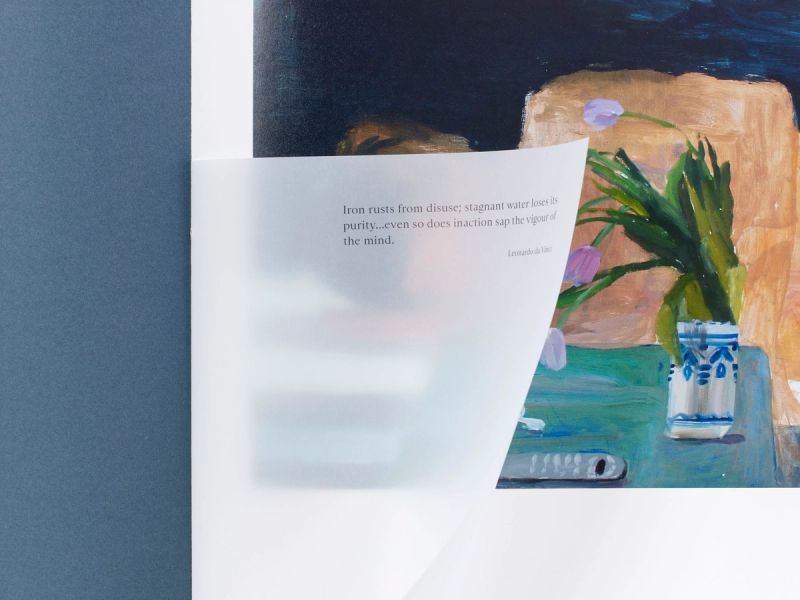 The layout and typography are inspired by early 20th-century artist monographs, with large artwork plates, immersive full-bleed details and endpapers, as well as traditionally set typography. The bespoke masthead includes an unusual ligature connecting the N and U; headings are set in A Practice For Everyday Life's Type Foundry’s Marquis – a humanist sans-serif with reference to early 20th-century British typefaces. While the expressive serif Sainte Colombe was chosen for body text and captions throughout the publication. The OTA-bound softcover book is enclosed in a paper-wrapped slipcase with foiled typography and a debossed tip-on plate.